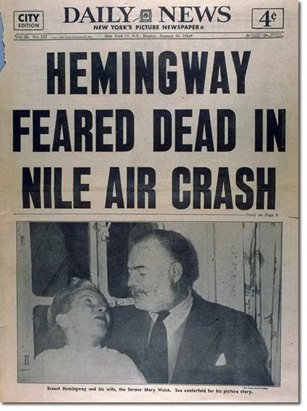 Hemingway and Wife Are Reported Safe After Two Plane Crashes in East Africa