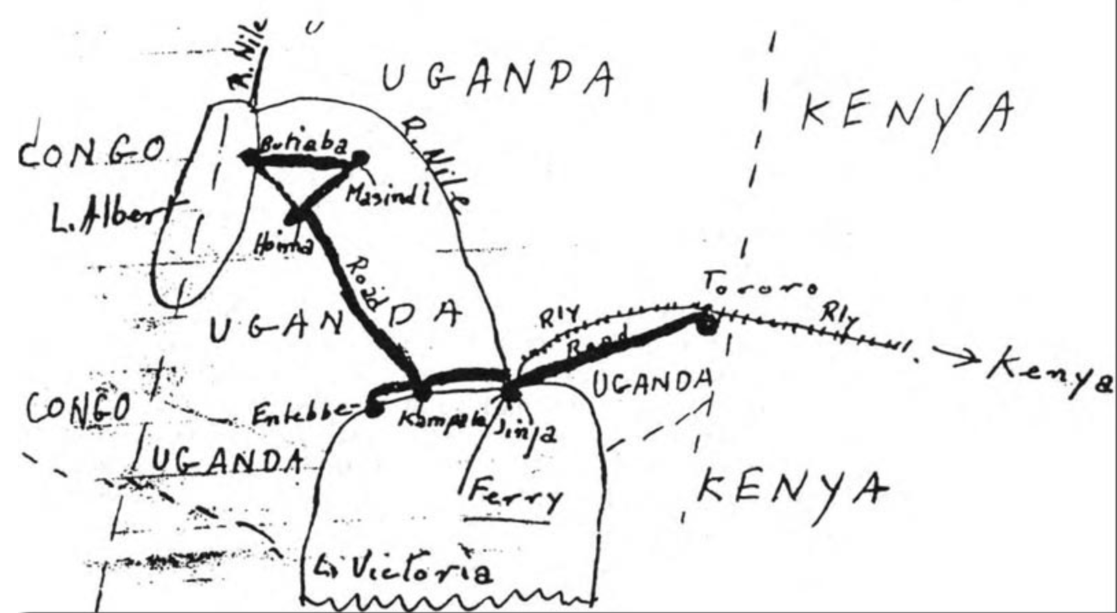 Distances: Tororo - Jinja, 100 miles; Jinja - Kampala, 54; Kampala - Entebbe, 25; Kampala - Hoima 128; Hoima- Masindi, 34; Masindi-Butiaba,45; Butiaba- Hoima, 35.