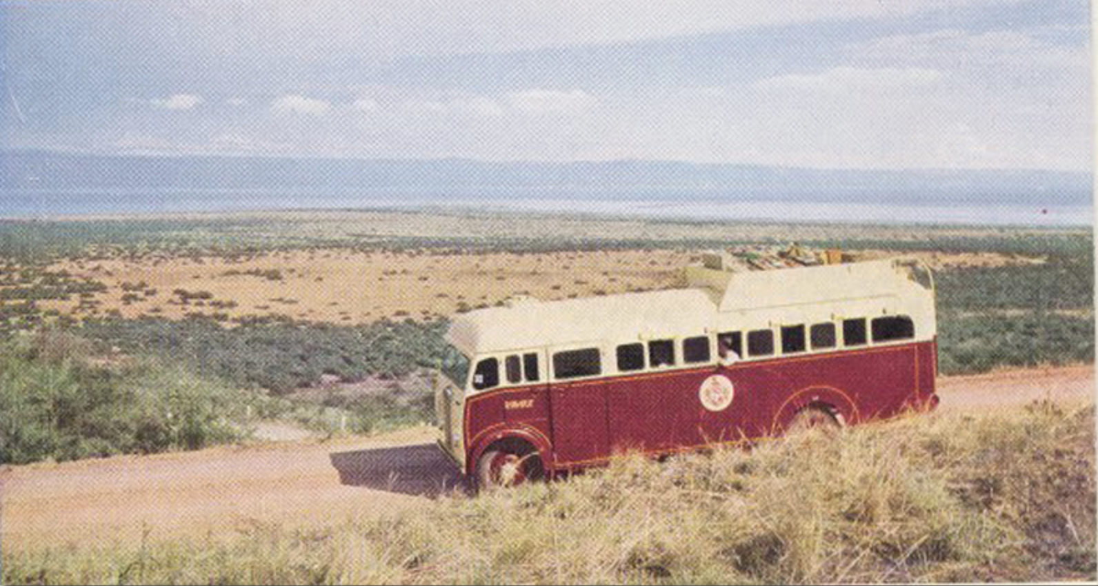 This picture from the 1950s shows a bus travelling along the route outlined by the author - from Masindi to Butiaba and clearly shows the immense Lake Albert in the background. Image courtesy of Malcolm McCrow